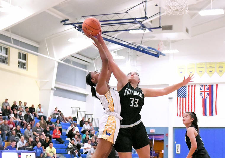 Kaliana Salazar-Harrell added 13 points, hitting one 3-pointer, and Grace Hing had eight points for Konawaena, which led 26-18 at halftime.
