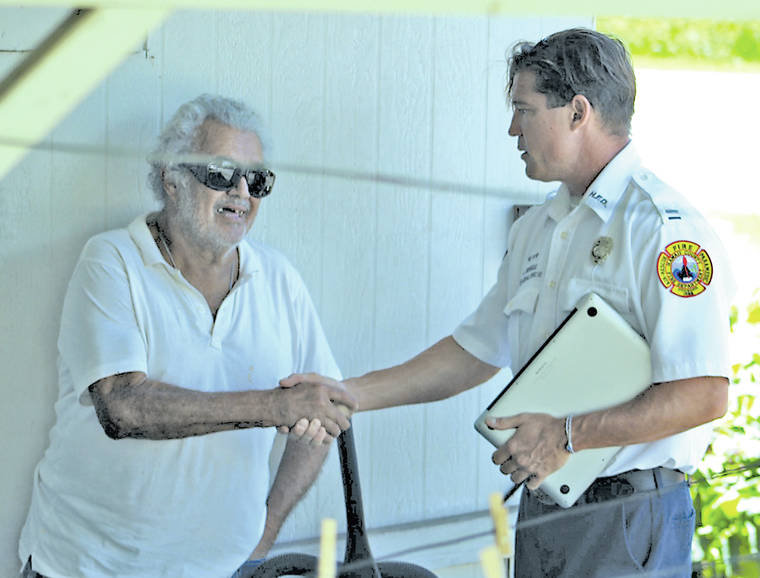 Tribune-Herald file photo Hilo resident Milton McNicholl shakes hands with a Hawaii Fire Department medical specialist during a July 2017 visit that was part of the department's Community Paramedicine Pilot Program.