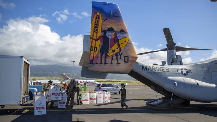 So those three boxes turned into more than 30 boxes — “big boxes,” as Santiago described them. And on Dec. 18, about 15 Marines jumped aboard two Osprey aircraft and jumped the ocean to deliver thousands of toys to Kona.