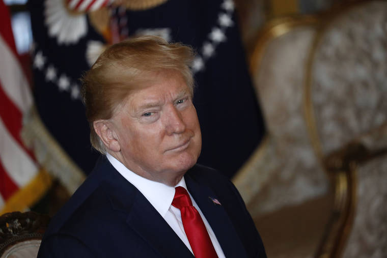 President Donald Trump attends a Christmas Eve video teleconference with members of the mIlitary at his Mar-a-Lago estate in Palm Beach, Fla., Tuesday, Dec. 24, 2019. (AP Photo/Andrew Harnik)
