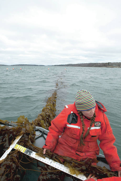 In this March 2016 photo, Bigelow Laboratory Research Associate Brittney Honisch measures a piece of sugar kelp before harvest in Casco Bay, Maine. (Scott Sell/The Island Institute via AP)