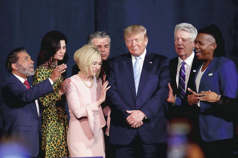 Faith leaders pray with President Donald Trump on Friday during a rally for evangelical supporters at the King Jesus International Ministry church in Miami. (AP Photo/Lynne Sladky)