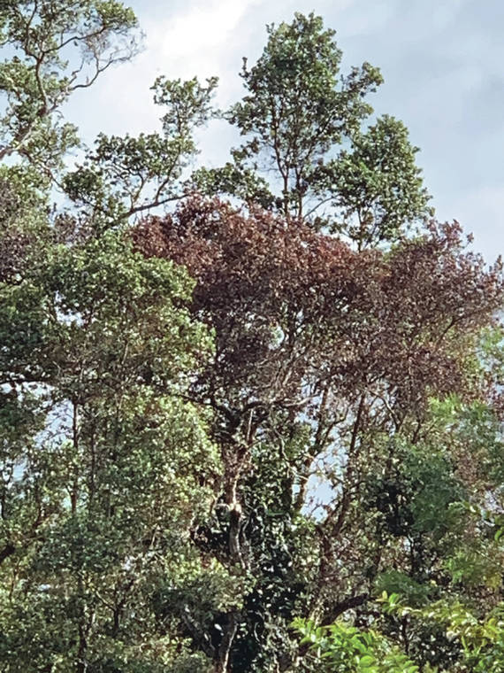 Rapid ohia death appears to be a relatively new fungus disease in Hawaii and is killing trees all over the Islands. But with heavy rains and unusually warm weather in West Hawaii, we are seeing a new disease attacking our ohia. This fungus attacks the leaves and causes premature leaf drop. It is similar to the disease that killed most Rose Apple trees in East Hawaii. This is a close relative of the ohia and guava. If the weather continues to warm, it is likely we will see more diseases in the normally cool areas of the islands. For example in Kaloko Mauka, we are seeing fungus diseases attacking palms like the Howea forsteriana that did quite well until the recent warming trend.