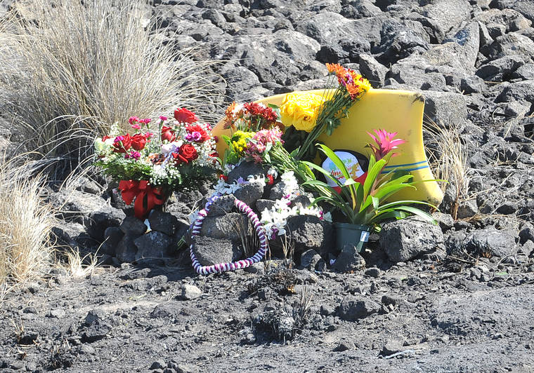 Laura Ruminski/West Hawaii Today file photo A roadside memorial for Cassandra “Cassie” Lynn Ellis is set up by the crash site on the mauka side of Queen Kaahumanu Highway on Nov. 11.
