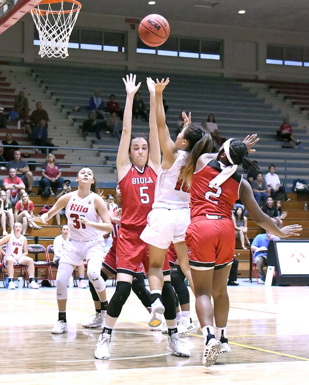 RICK OGATA photo UH-Hilo’s Sara Shimizu tries to get a shot off in traffic against Biola.