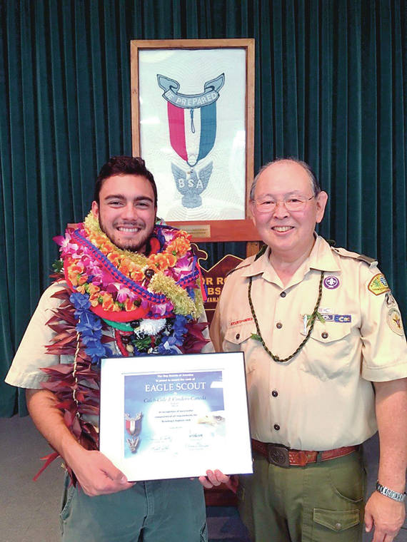 Caleb-Cole Caneda, 17, of Boy Scout Troop 23, was presented with Scouts BSA’s highest rank of Eagle Scout at a Court of Honor held Jan. 5 at Honpa Hongwanji Hilo Betsuin’s Sangha Hall, sponsor of Scouts BSA Troop 23.