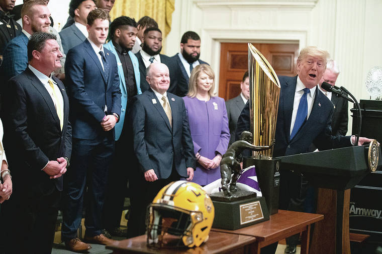 President Donald Trump speaks during an event to honor the NCAA football national champions, Louisiana State University Tigers, in the East Room of the White House Friday in Washington. (AP Photo/ Evan Vucci)