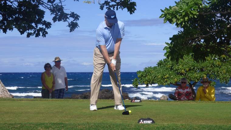 Fred Couples watches his shot from the 18th tee during the second round of the Mitsubishi Electric Championship at Hualalai on Friday. Couples finished the round 4-under 68 to tie for third place heading into the final round of the PGA Tour Champions tournament. (Elizabeth Pitts/West Hawaii Today)