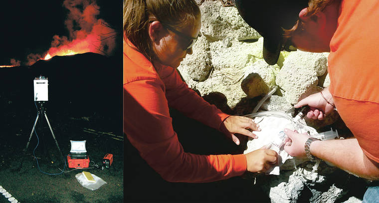 Photo captions: As fissure 8 erupts on Kilauea Volcano’s lower East Rift Zone in June 2018 (left), a Fourier Transform Infrared (FTIR) spectrometer measures gas emissions from the lava fountains. At right, Hawaiian Volcano Observatory gas geochemistry team members collect a sample of gas from Sulphur Banks in Hawaii Volcanoes National Park. USGS photos.