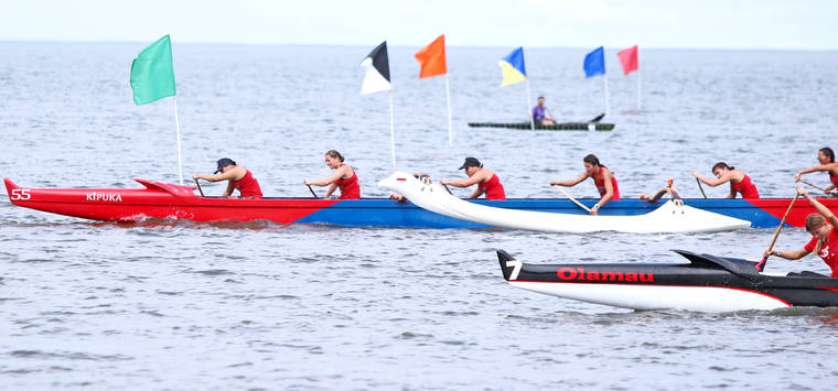 1. Keaau (Jonray Enriques, Kyla Fabiani, Lori “Boi” Aiu, Liana Prudholm, Lexie Prudholm, Cother-McKeague La’a), 4:26.55; 2. HPA, 4:29.39; 3. Kealakehe, 4:39.19; 4. Kamehameha, 4:51.74