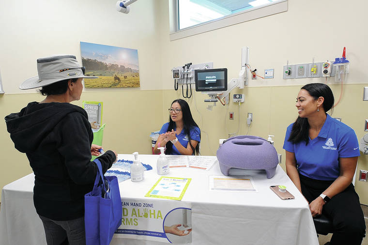 Erin Matsunaga, left and Michelle Aikau demonstrate proper hand sanitizing techniques at North Hawaii Community Hospital’s new emergency room open house on Saturday. (Laura Ruminski/West Hawaii Today)