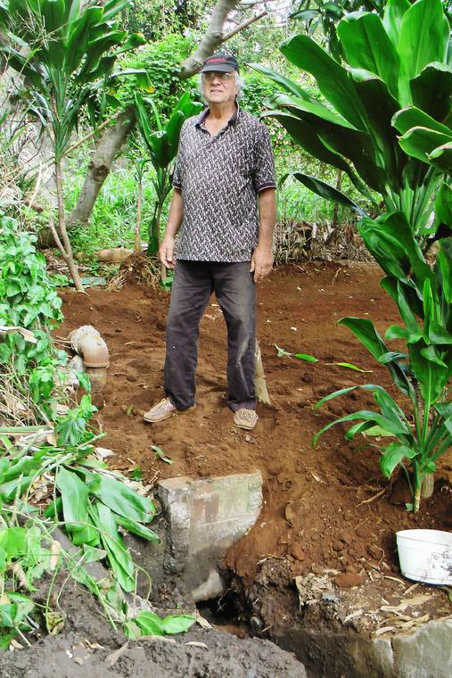 Naalehu resident Jerry Warren stands near a trench Jan. 24, 2020, for the gang cesspool system there. (Joseph Demoruelle/Special to West Hawaii Today)
