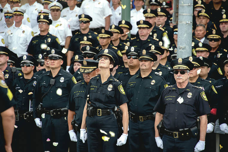 HONOLULU (AP) — Law enforcement officers from around the country gathered in Honolulu for a ceremony to honor one of two officers killed while responding to a call in which a suspect and his landlord died and nearby homes were leveled by fire.