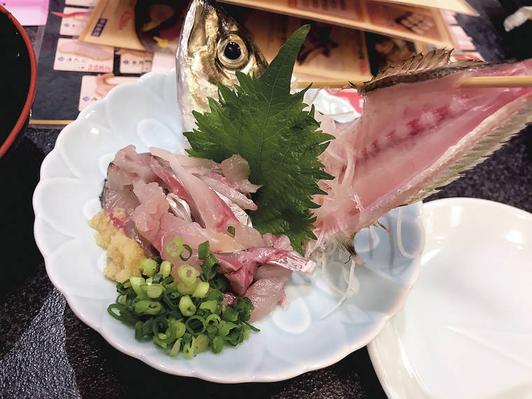 The ‘aji’ or opelu’s fin was still quivering, even after it was cut into sashimi. We ordered platters of sushi with an assortment of different kinds of fish, squid, scallops, raw sweet shrimp and salmon fish roe or ‘ikura. We also ordered miso soup that had a lot of mini clams.
