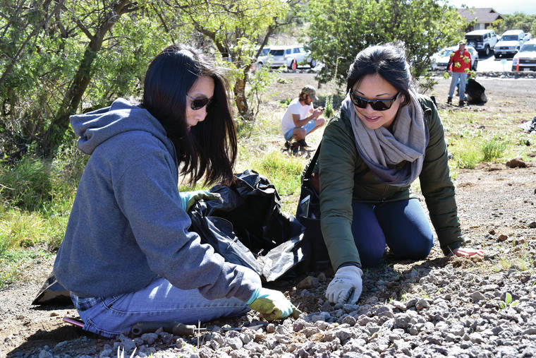 With near perfect weather conditions, although a bit cold, more than 20 volunteers participated in the Office of Maunakea Management’s Malama Maunakea community weed pull on Saturday. Volunteers helped pull invasive species around the Visitors Information Station while also learning to identify native species sprouting among the weeds. By the end of the morning, volunteers had pulled enough weeds to fill 43 garbage bags.