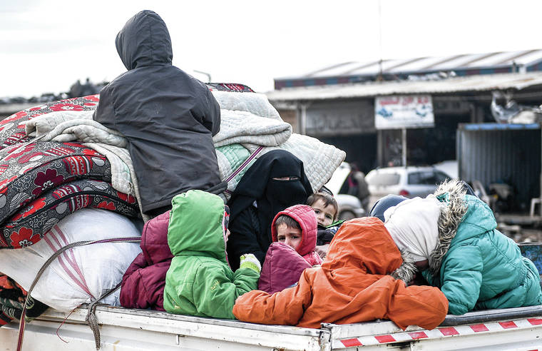 Civilians flee from Idlib toward the north to find safety inside Syria near the border with Turkey Saturday. (AP Photo)