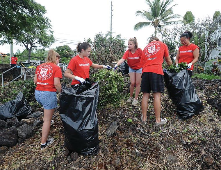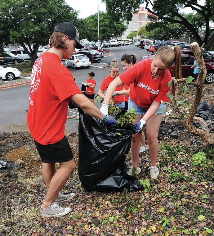 Partnering with the Kailua Village Business Improvement District, 25 members of the Youth With A Mission Kokua team started Saturday morning cleaning up the southeast end of the lot, removing rubbish, weeding and raking the overgrown area.