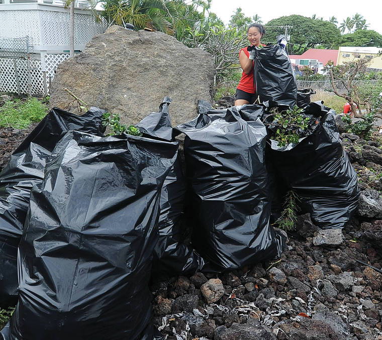 Kehau Gomes, treasurer of the business improvement district, was there with her crew working with the volunteers. The organization has been focusing efforts to help with the homeless situation in Kailua Village. They tackled cleaning up the north end of the lot, pruning trees that have been a gathering place for some undesirable individuals and planting bougainvilleas in the weeded planter box.