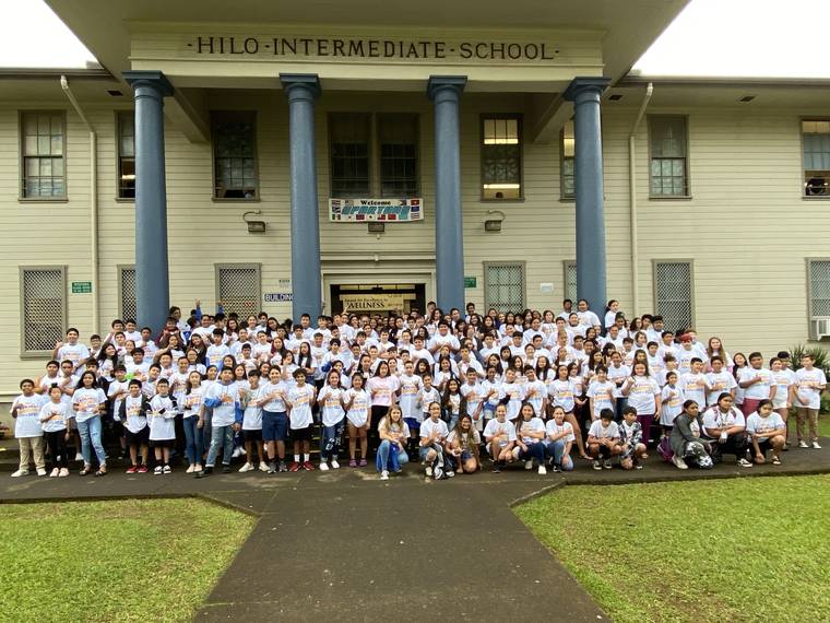The Hilo High Foundation recently took steps to encourage seventh-grade students at Hilo Intermediate School. In a December school assembly, Foundation President Allan Ikawa and Foundation Secretary Newton Chu presented the entire seventh-grade class with T-shirts emblazoned with the Hilo High Viking logo and a statement, “Vikings in Training, Class of 2025.”