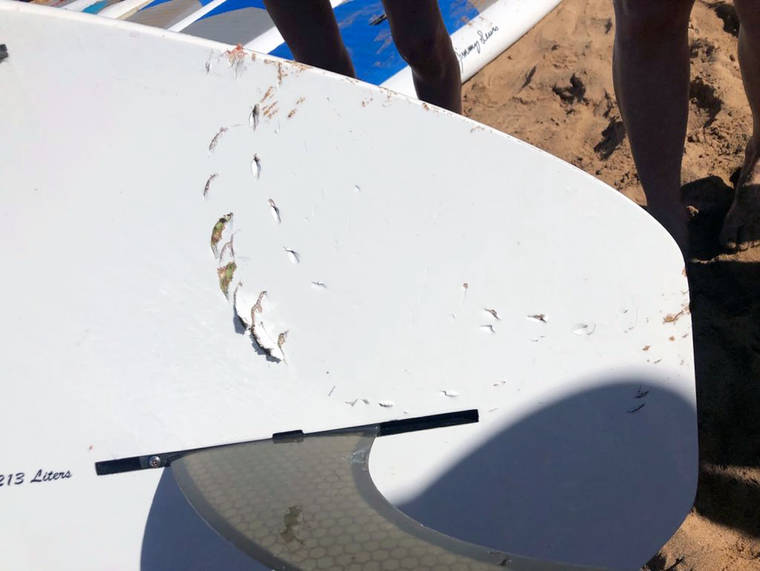 Kahookele-Santos used the blade of his paddle to strike the shark, which let go of the board and turned on Kahookele-Santos. The others paddled safely to shore as he fought off the shark with the paddle while it circled him three times.