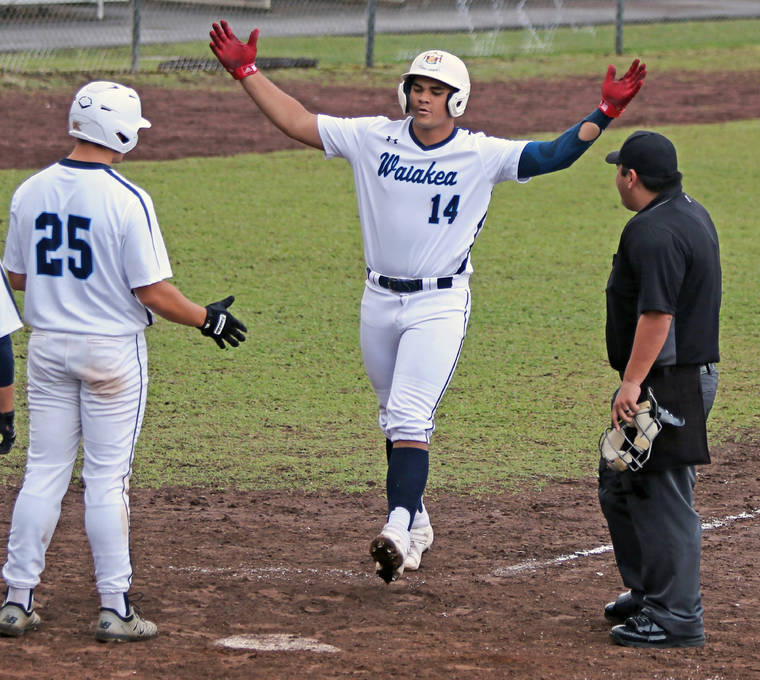 Waiakea’s Safea Villaruz-Mauai celebrates his third run during Thursday’s game against Kamehameha, played at Wong Stadium. Photo: Tim Wright