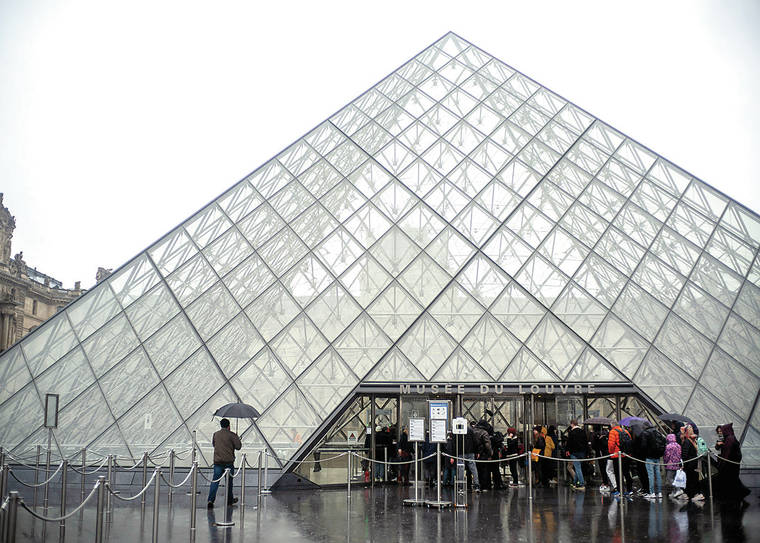 Tourists stand outside the Louvre museum Sunday in Paris, France. The spreading coronavirus epidemic shut down France's Louvre Museum on Sunday, with workers who guard its trove of artworks fearful of being contaminated by the museum's flow of visitors from around the world. (AP Photo/Rafael Yaghobzadeh)
