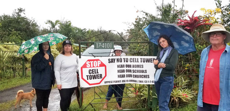 MIKE BRESTOVANSKY/Tribune-Herald From left, Anna Maneja, Edelyn Ellwood, Carlita Maneja, Ramona Araujo and Prescott Ellwood oppose the construction of a nearly 200-foot-tall cellphone tower on an agricultural lot in Kurtistown.