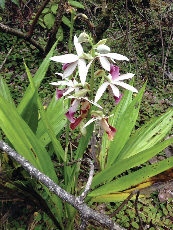 Courtesy of Voltaire Moise The Chinese Ground Orchid (Phaius tankervilliae) May be found growing wild in cool wet regions of the island. Several colorful hybrids are also available at local garden shops and nurseries.