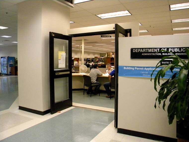 The Department of Public Works is one office where the doors are propped open so people don’t have to touch them. (Nancy Cook Lauer/West Hawaii Today)