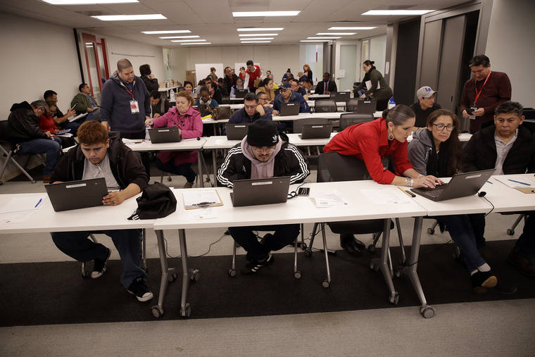Unionized hospitality workers apply for unemployment benefits at the Hospitality Training Academy Friday, March 13, 2020, in Los Angeles. Fearing a widespread health crisis, Californians moved broadly Friday to get in front of the spread of the coronavirus, shuttering schools that educate hundreds of thousands of students, urging the faithful to watch religious services online and postponing or scratching just about any event that could attract a big crowd.(AP Photo/Marcio Jose Sanchez)