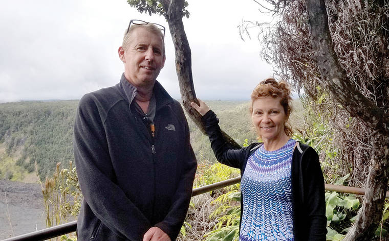 MICHAEL BRESTOVANSKY/Tribune-Herald Tom Gardiner and Pat Eilers of Michigan visit Hawaii Volcanoes National Park on Wednesday.