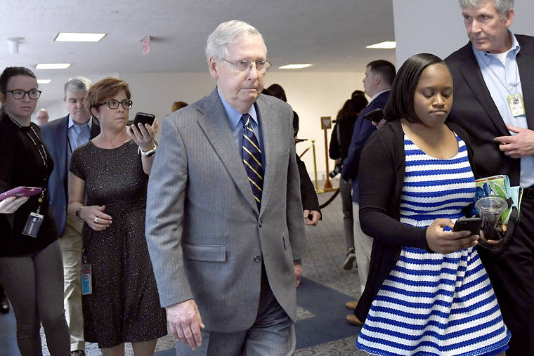 Senate Majority Leader Mitch McConnell is followed by reporters and staff as he leaves a meeting Friday on Capitol Hill in Washington. (AP Photo/Susan Walsh)