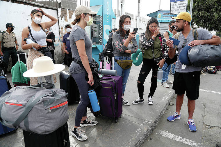 Tourists from the United States wait on Friday outside the closed Jorge Chavez International Airport in Callao, Peru, for a member of the U.S. Embassy to escort them to a flight that will take them back to the U.S. (AP Photo/Martin Mejia)