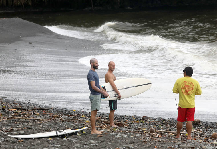 KELSEY WALLING/Tribune-Herald Alex Spivak, left, and Walter Grenell talk with a lifeguard before entering the water at Honoli’i Beach Park in Hilo on Thursday, March 26, 2020. Although the park is closed, surfers can go out to the water as long as they don’t stay on the beach.