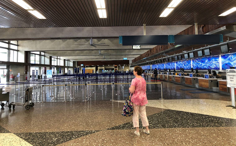 Few people are in the departure lobby at Honolulu’s Daniel K. Inouye International Airport on Thursday, March 26, 2020, as Hawaii imposed a 14-day traveler quarantine to slow the coronavirus. Travelers landed in Hawaii to a new requirement that they hole up in hotel rooms or their homes for 14 days to fight the spread of the virus. (AP Photo/Audrey McAvoy)