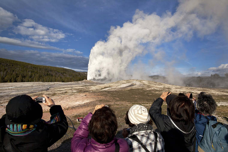 FILE - In this May 21, 2011 file photo, tourists photograph Old Faithful erupting on schedule late in the afternoon in Yellowstone National Park, Wyo. On Tuesday, March 24, 2020 the National Park Service announced that Yellowstone and Grand Teton National Parks would be closed until further notice, and no visitor access will be permitted to either park..(AP Photo/Julie Jacobson, File)