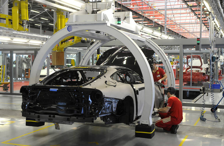 FILE - In this Wednesday, May 8, 2013 file photo, a technician works at the Ferrari department factory in Maranello, Italy. The eurozone's third-largest economy and a major exporter, Italy on Wednesday becomes the first western industrialized nation to idle swaths of industrial production to stop the spread of coronavirus by keeping yet more of the population at home. The new coronavirus causes mild or moderate symptoms for most people, but for some, especially older adults and people with existing health problems, it can cause more severe illness or death. (AP Photo/Marco Vasini, File)