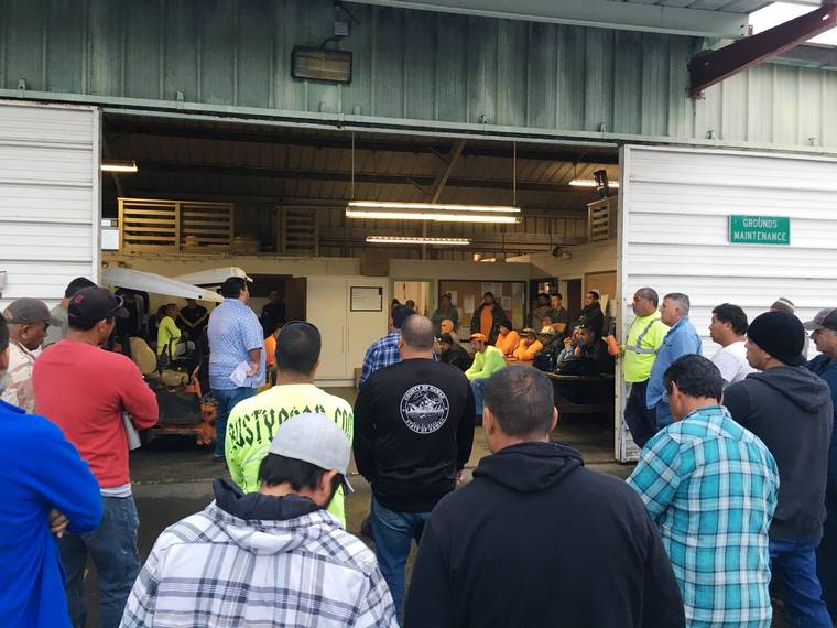 Poindexter shared a photo of a meeting of Parks maintenance workers in Hilo that showed them crowded into and around the Hilo grounds maintenance baseyard building without observing the 6-foot social distancing or maximum of 10 to a room rule, which she said was taken by a parks worker at the meeting Monday.