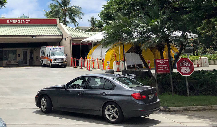 This March 20 photo shows yellow coronavirus testing tents at the entrance to the emergency room of The Queen's Medical Center in Honolulu, one of the hospitals in Hawaii where many mentally ill patients are taken. (AP Photo/Audrey McAvoy)