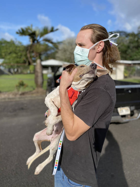 LAUREN NICKERSON/Hawaii Island Humane Society Hawaii Island Humane Society animal care technician Brendan Souza carries Brax to meet his new foster mom in the parking lot. HIHS is doing drive-up pickups for fosters and adopters to promote social distancing.