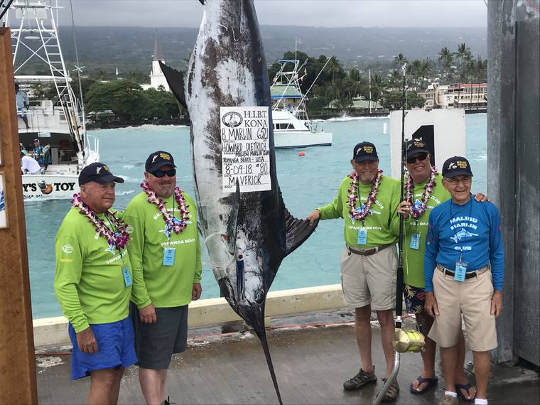 Malibu Marlin Club - Topanga Beach pose with their 652.1-pound during the 2018 Hawaiian International Billfish Tournament. (J.R. De Groote/West Hawaii Today file)