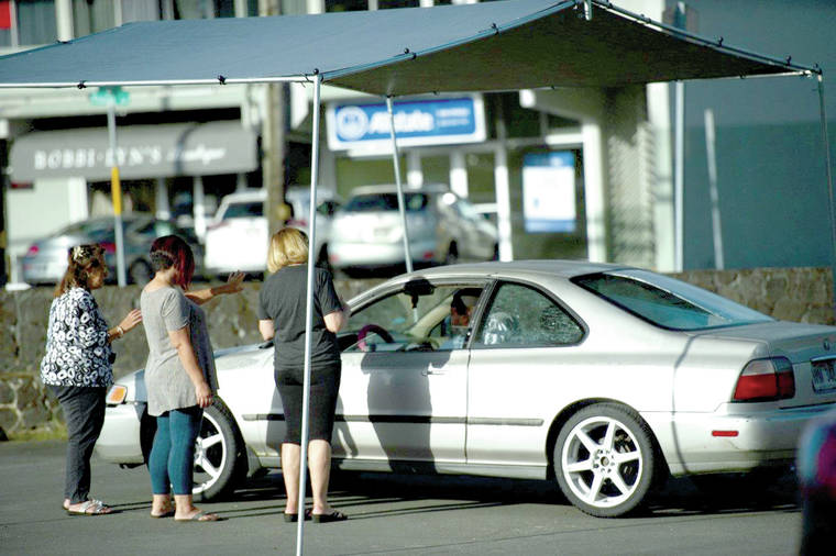 Arise Church conducted drive-through prayer March 25 at the church’s Kilauea Avenue office in Hilo. The Arise Church team prayed as people drove up.