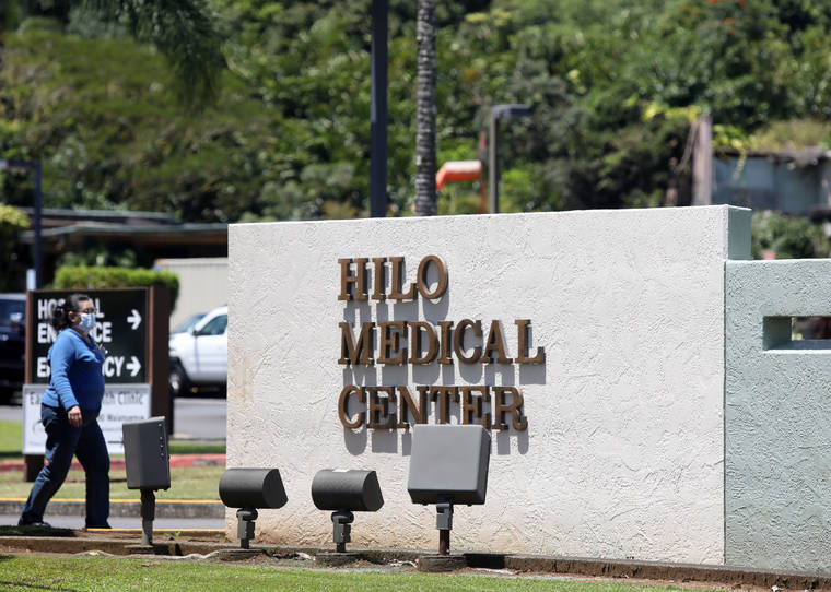 KELSEY WALLING/Tribune-Herald A medical professional walks past the Hilo Medical Center sign Thursday before entering the hospital in Hilo.