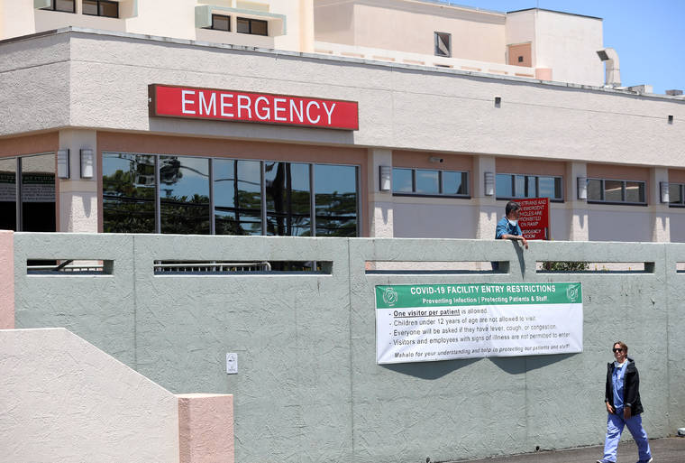 KELSEY WALLING/Tribune-Herald file photo Medical professionals walk and stand near the COVID-19 restriction rules April 2 outside Hilo Medical Center in Hilo. Both professionals wore medical masks around their necks before going inside.