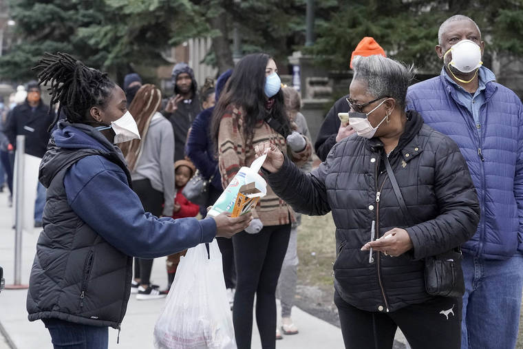 A worker hands out disinfectant wipes and pens as voters line up outside Riverside High School for Wisconsin’s primary election Tuesday April 7, 2020, in Milwaukee. The new coronavirus causes mild or moderate symptoms for most people, but for some, especially older adults and people with existing health problems, it can cause more severe illness or death. (AP Photo/Morry Gash)