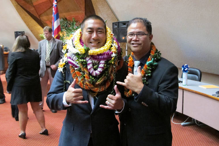 FILE - In this May 5, 2016 file photo, former Hawaii Rep. Derek Kawakami, left, and Rep. James Tokioka, right, both of Kauai, pose for photos in Honolulu. Kawakami has a choice word for a Florida man accused of trying to flout Hawaii’s traveler quarantine: “covidiot.” He isn’t taking credit for coining the word borne out of the COVID-19 pandemic, but said, “I may be the first elected official to bust it out in public.” (AP Photo/Cathy Bussewitz, File)