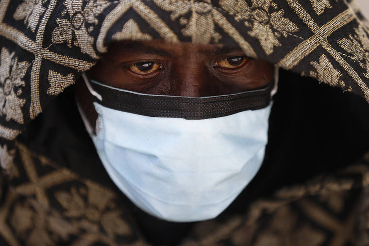 A man wears a protective mask while waiting for a bus in Detroit, Wednesday, April 8, 2020. Detroit buses will have surgical masks available to riders starting Wednesday, a new precaution the city is taking from the new coronavirus COVID-19. (AP Photo/Paul Sancya)