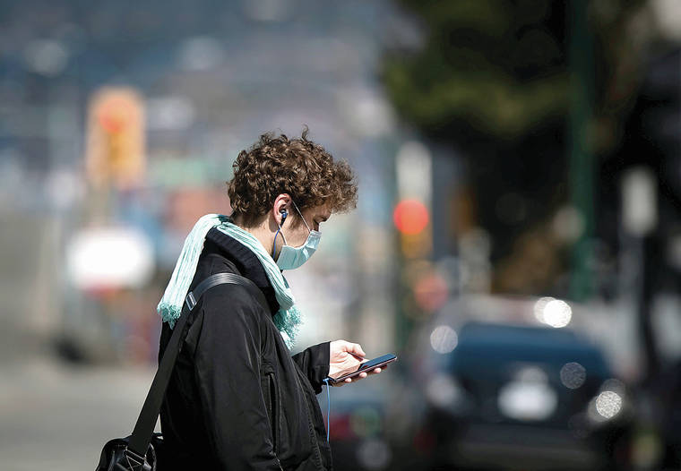 A man wearing a protective face mask looks at his phone Friday while walking in the Downtown Eastside of Vancouver, British Columbia. (Darryl Dyck/The Canadian Press via AP)