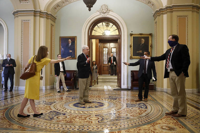 Senate Majority Leader Mitch McConnell of Ky., center, speaks with reporters outside the Senate chamber on Capitol Hill in Washington, Thursday, April 9, 2020. Senate Democrats on Thursday stalled President Donald Trump’s request for $250 billion to supplement a “paycheck protection” program for businesses crippled by the coronavirus outbreak, demanding protections for minority-owned businesses and money for health care providers and state and local governments. (AP Photo/Patrick Semansky)