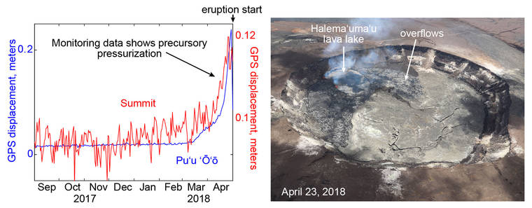 Specifically, tiltmeter and GPS stations recorded rapid uplift of the ground surface, best explained as the result of increasing pressure within the magmatic plumbing system at Puʻu ʻOʻo, starting in March 2018. Rapid uplift began at the summit of Kilauea a few weeks later as the summit reservoir began inflating. This pressurization was widespread and drove lava lakes at Puʻu ʻOʻo and the summit to unusually high levels, causing the largest overflows in Halemaʻumaʻu during the entire 10-year lifespan of the lava lake.